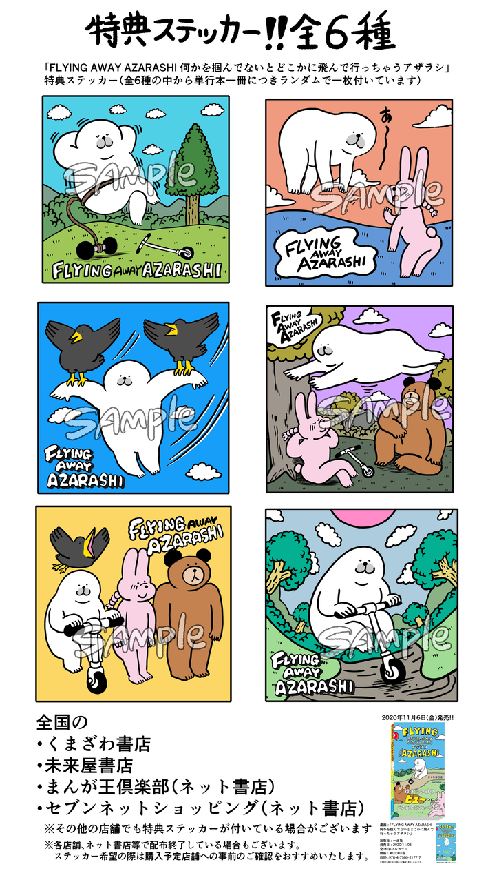 「FLYING AWAY AZARASHI 何かを掴んでないとどこかに飛んで行っちゃうアザラシ」の単行本が11月6日に発売することになりました!☝️ (うれしーっ☝️) ありがたいことに 購入特典でステッカーも付いてきます! ※ ...