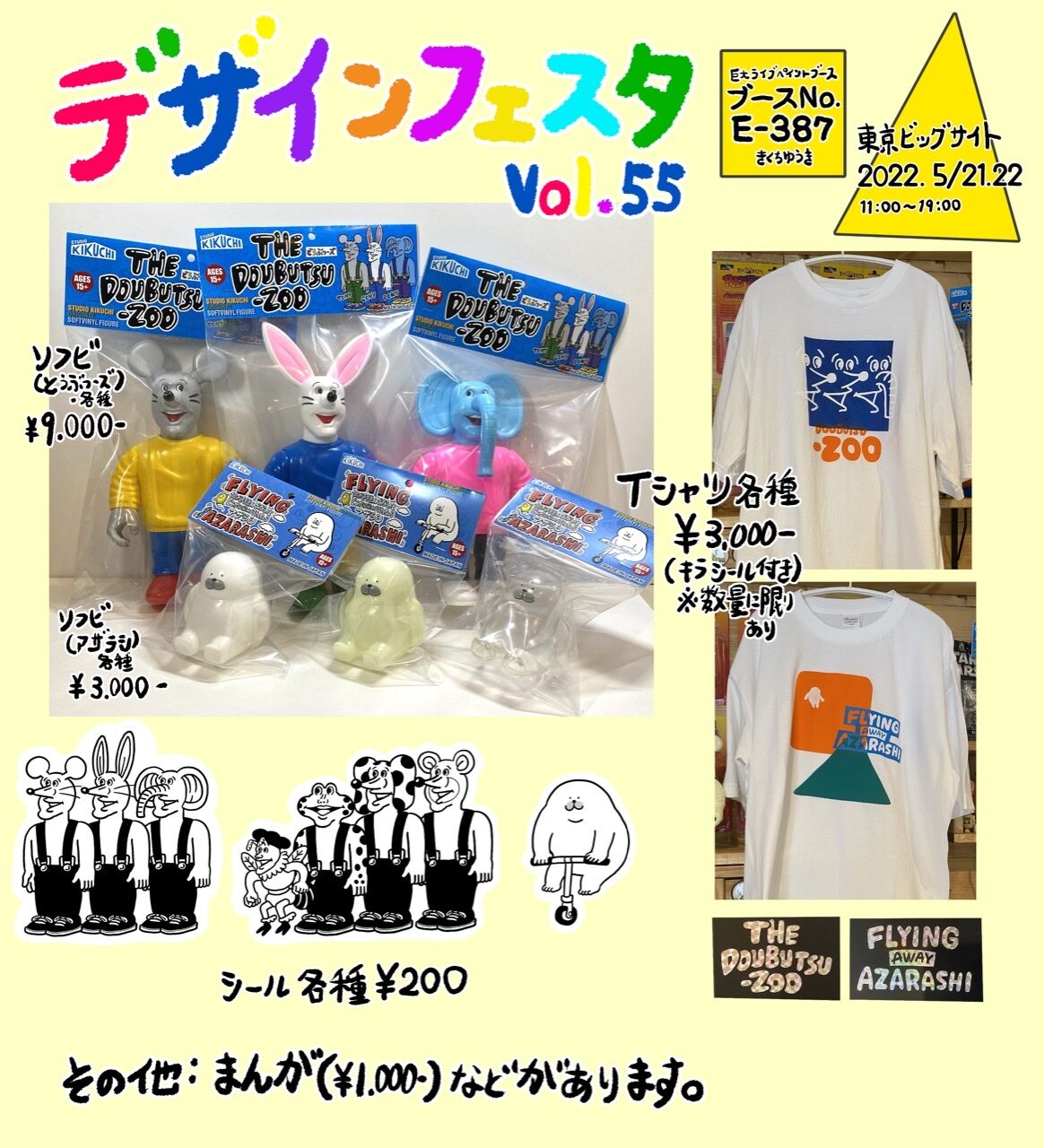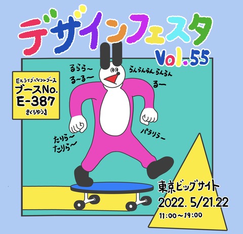 「明日はデザインフェスタvol.55」 こんちわ。 デザインフェスタに巨大ライブペイントブースにて出展します☝️ 久しぶりのイベントで楽しみだ。 いろんな人に会えるとうれしい。 横8メートル縦3.6メートルの壁にライブペイントします! これは前回描いている時のやつ 今回は何が描けるかな ... 続きを読む 2022/05/20 こんちわ。 デザインフェスタに巨大ライブペイントブースにて出展します☝️ 久しぶりのイベントで楽しみだ。 いろんな人に会えるとうれしい。 横8メートル縦3.6メートルの壁にライブペイントします! これは前回描いている時のやつ 今回は何が描けるかなあと、ちっと不安。 14時〜15時、と18時〜19時は物販に立ってます。そのほかの時間はお手伝いさんが物販してくれています。 よろしくお願いします💪👶 「デザインフェスタvol.55」 2022年5月21日(土)22日(日) 場所:東京ビッグサイト 11〜19時 チケット:前売り800円、当日1000円 ※感染症予防のため、入場の際に連絡先の記入をお願いされます。詳しくはデザインフェスタ公式サイトをチェックしてください☝️ ソフビ、マンガ、Tシャツ、シールとかあります。 Tシャツ一枚購入につき、希望される方にはキラシール一枚もらえます。ぜひもらってほしい。 よろしくお願いします🙏 もしも、もしもサインが欲しいとかそういうのあったら描かせてもらうので物販に立っている時間に話しかけてください!みんなが楽しめたら良いなと思ってます。 よろしくお願いします! ではまた!👋 ポチッと読者登録したら 更新通知がLINEで届くよ!!!👇